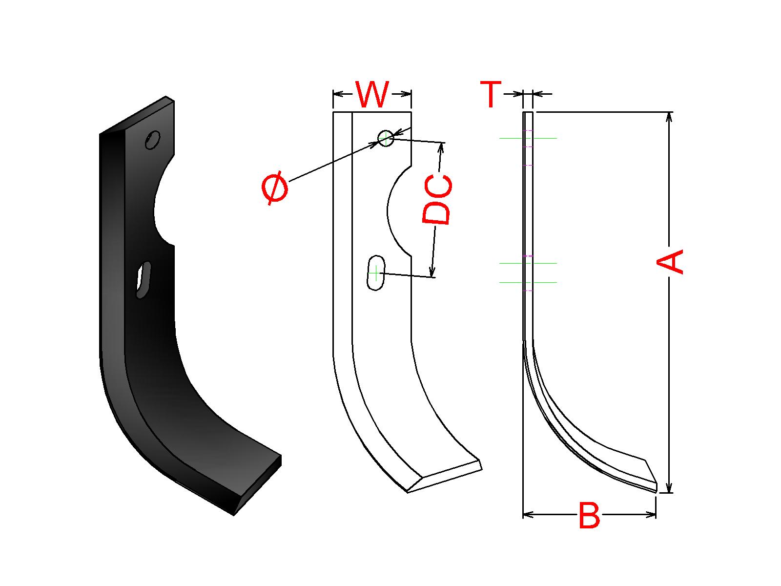 Cuchilla Ref: nº.758L / Medidas: A:220 B:70 /Pletina: 35X5 / Dist.centros: 65/75 / Taladro: 8,5 / Peso: kg